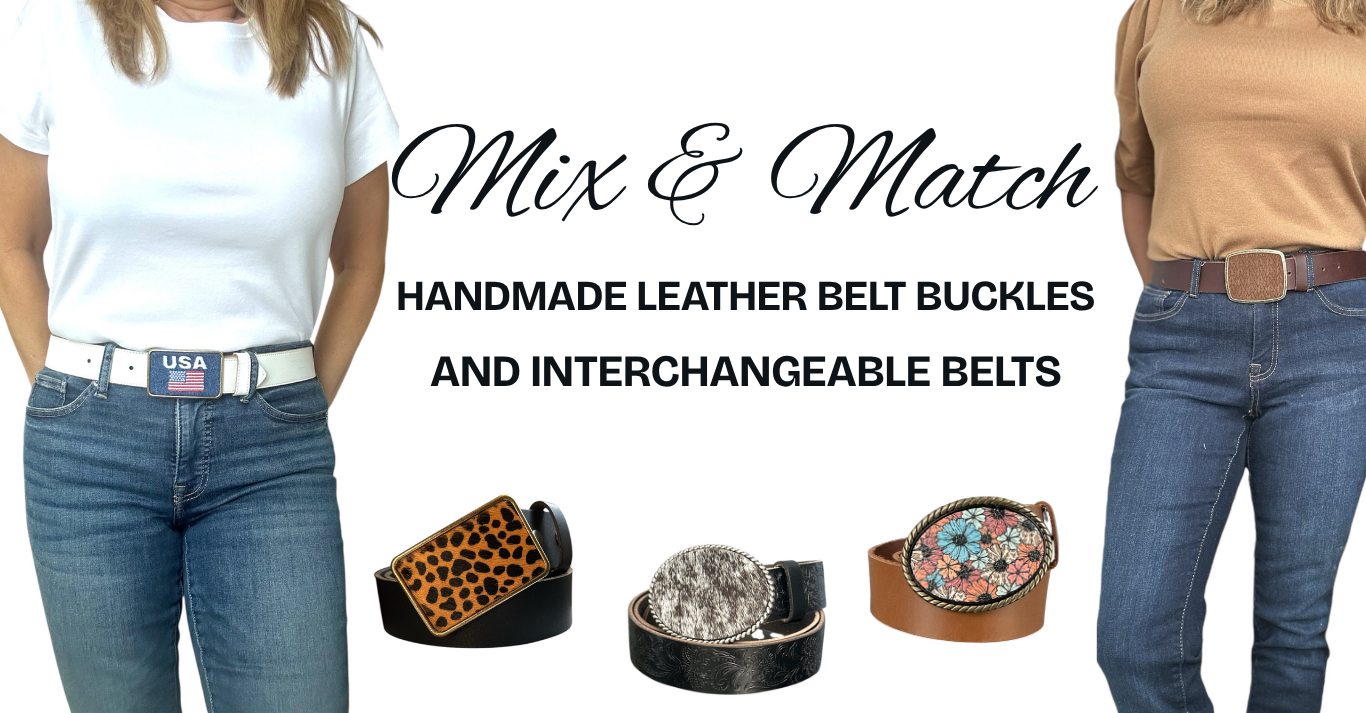 Each leather belt buckle is handmade with unique leathers and studded accents. Mix and match your favorite belt buckles with our interchangeable belts.