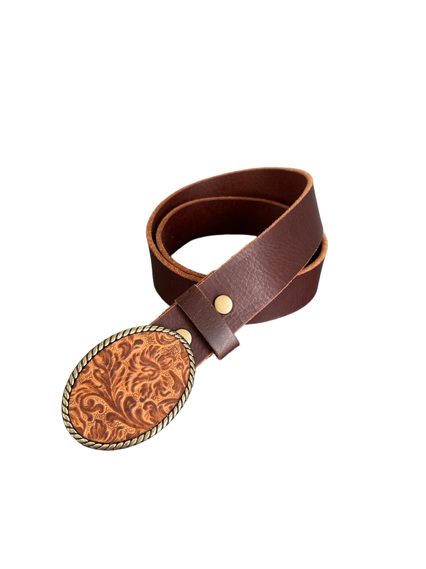 Add a touch of autumn to any outfit with our handmade leather belt buckle featuring embossed florals in rich brown hues. Designed to easily attach to a 1 1/2 inch belt, this antique brass rope buckle is perfect for making a fall fashion statement. (Belt not included)