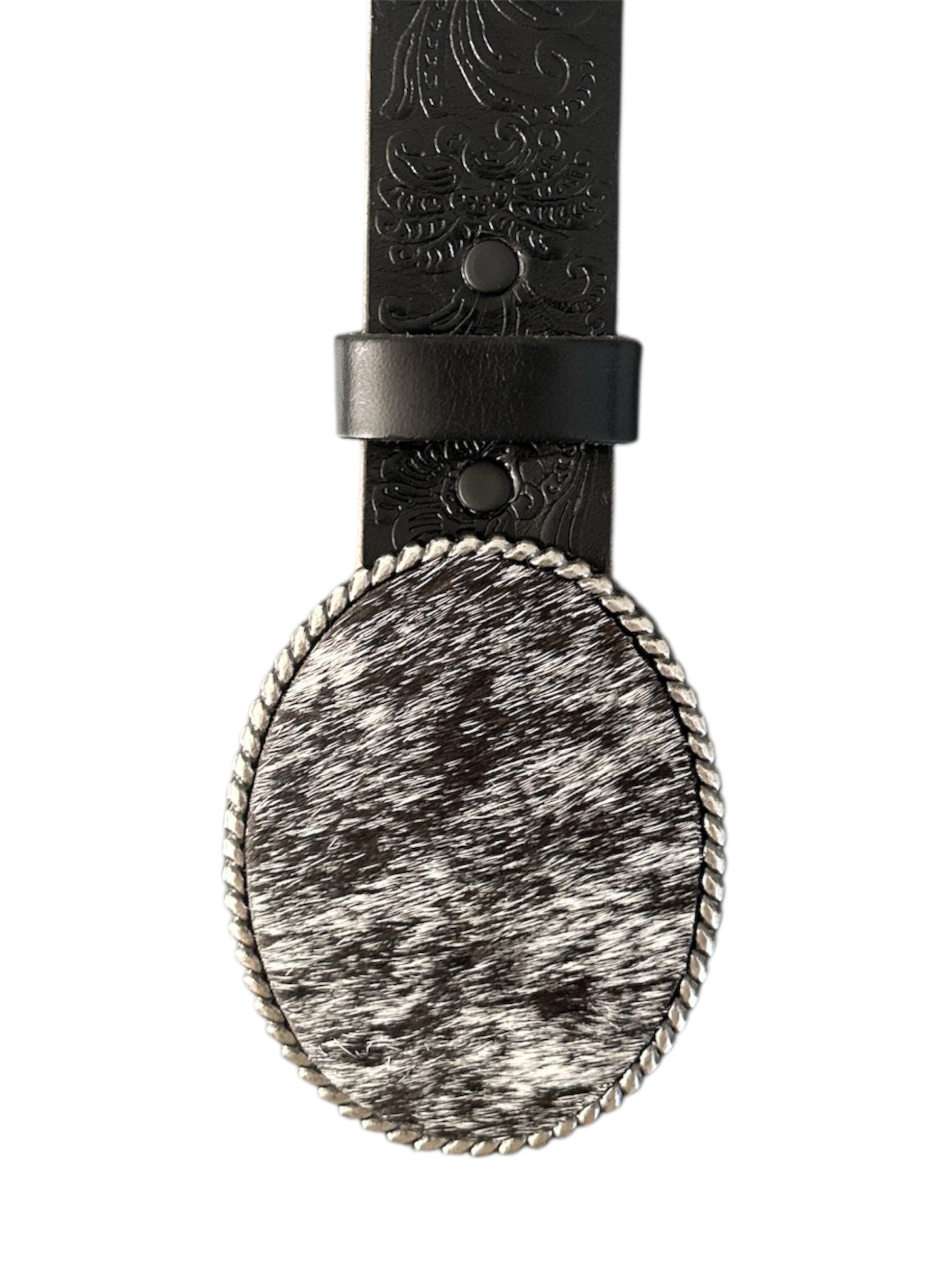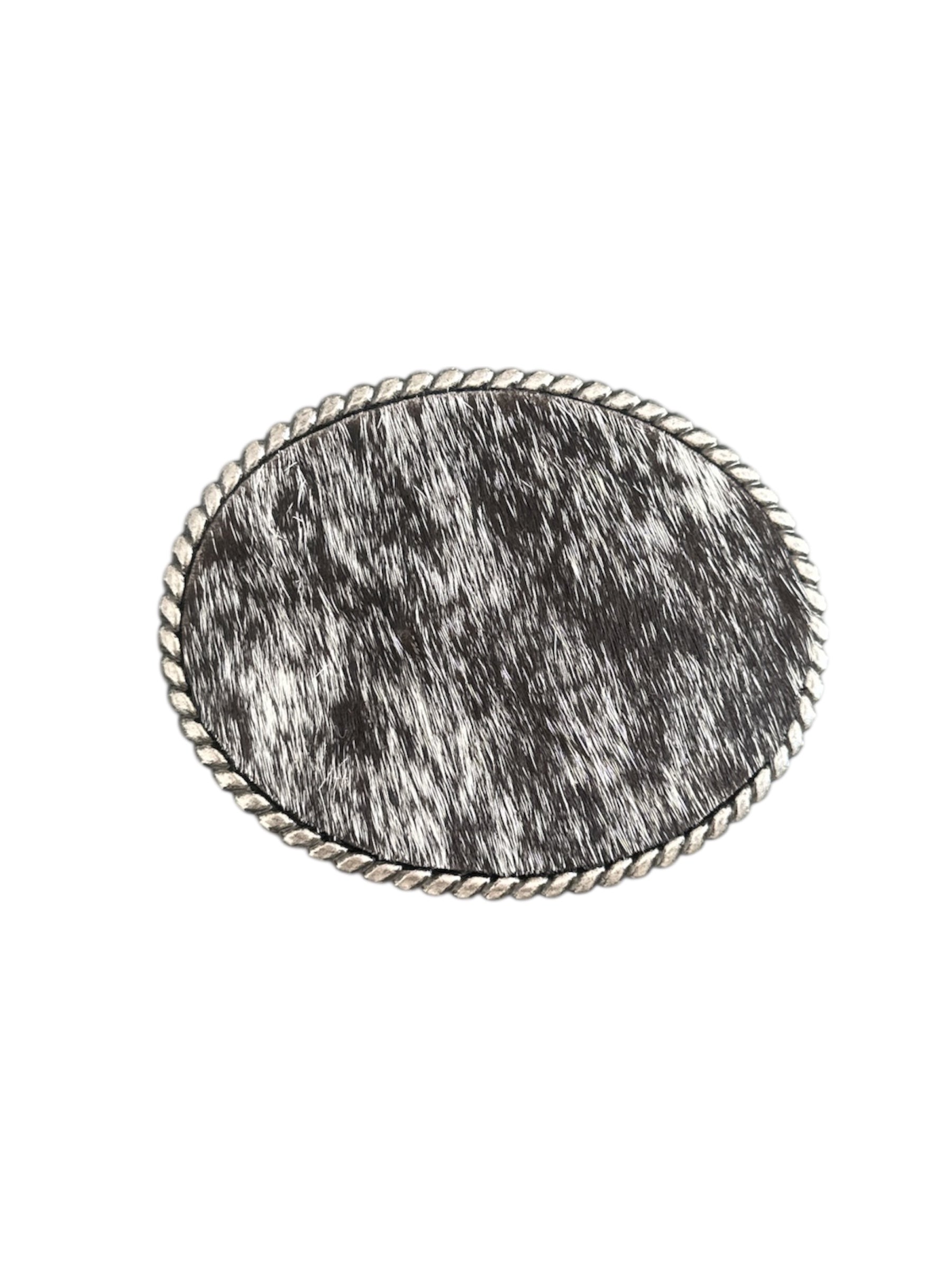 Black and White Hair on Hide Oval Rope Belt Buckle