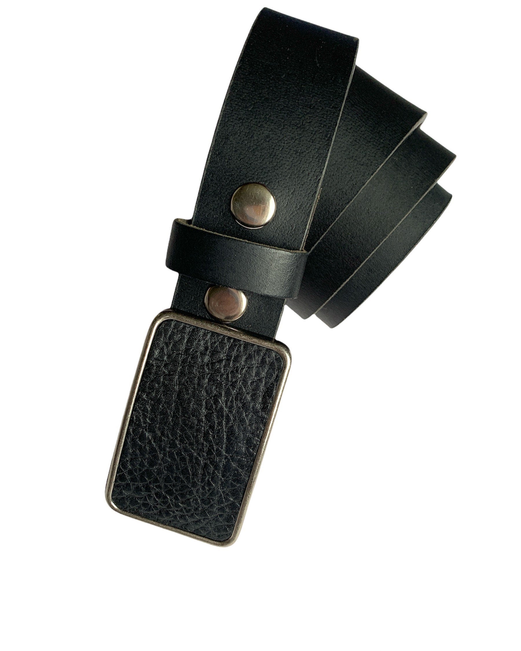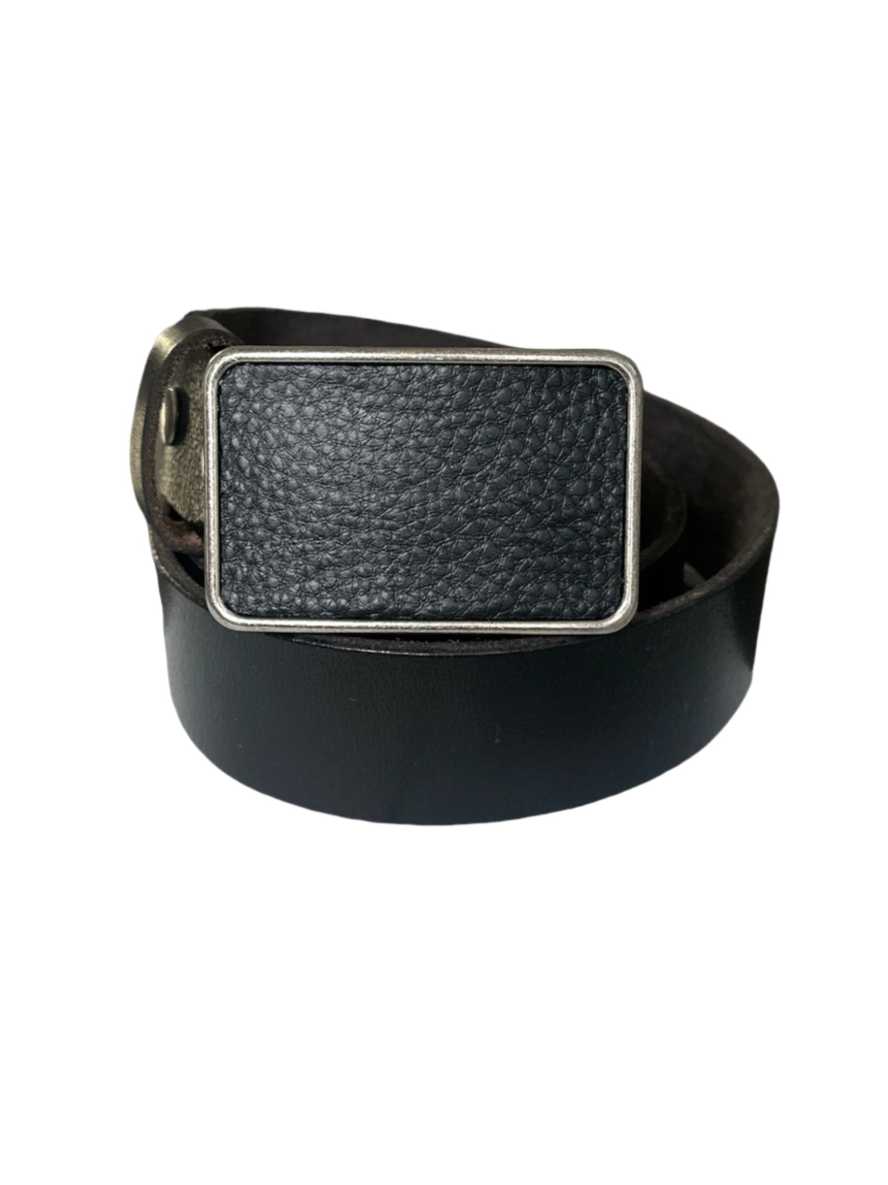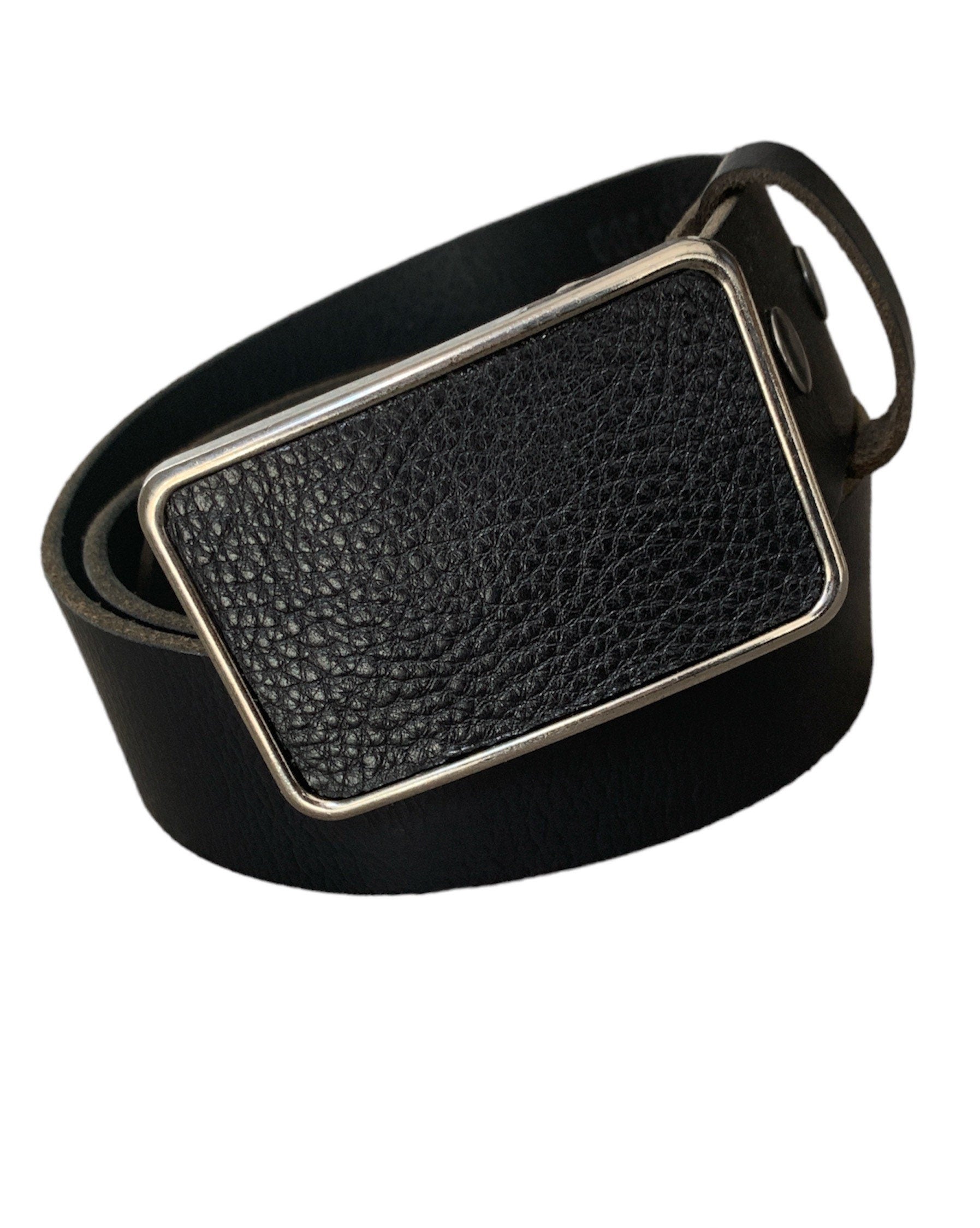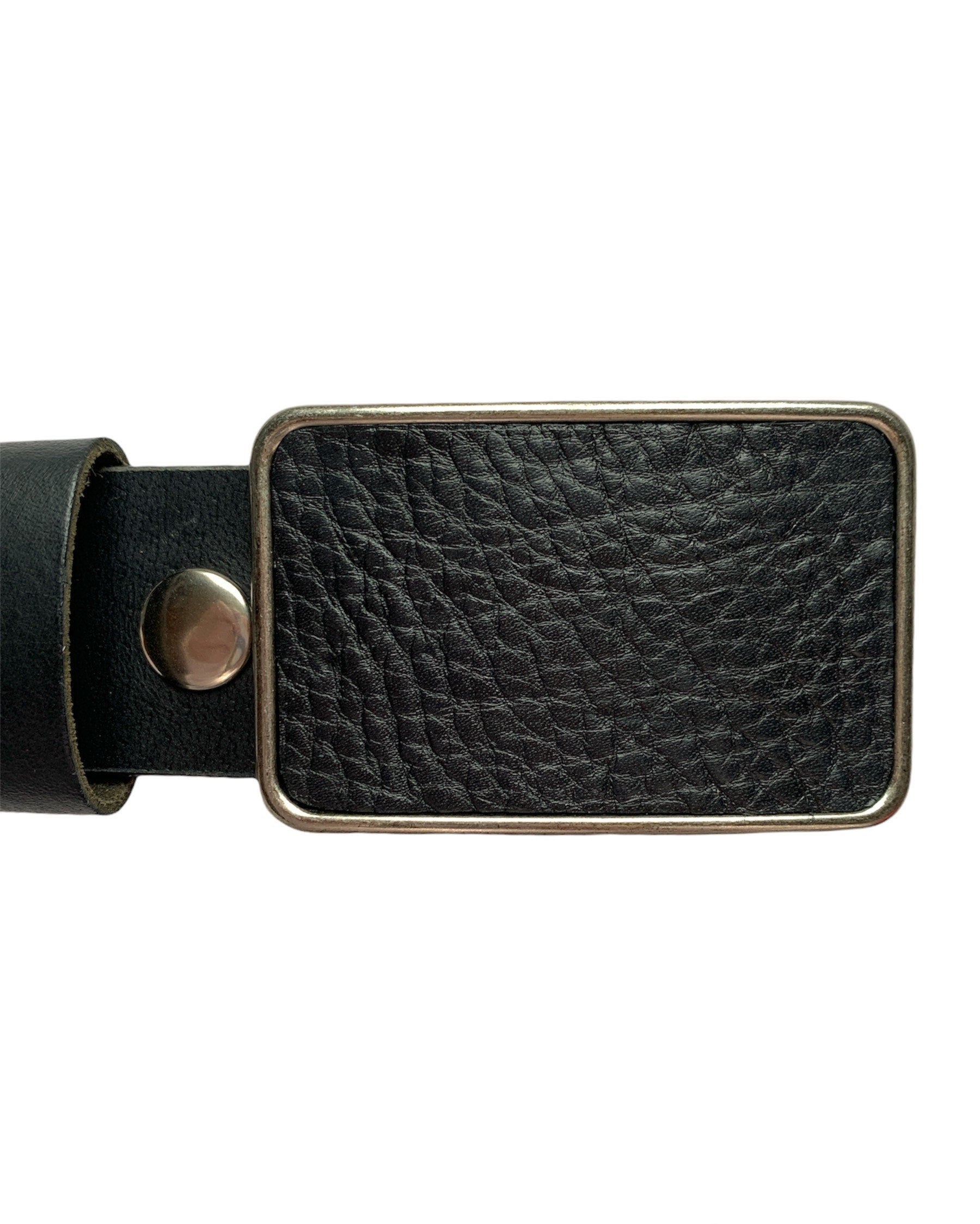 A pebbled leather belt buckle is a classic everyday accessory. The rectangular buckle is available in a silver tone finish. The pebbled leather buckle is versatile so it can be worn both casual and dressy. The buckle is available in genuine black leather. The buckle can be paired with an interchangeable snap belt. A standard 1.5" interchangeable snap belt will fit the Pebbled leather buckle.