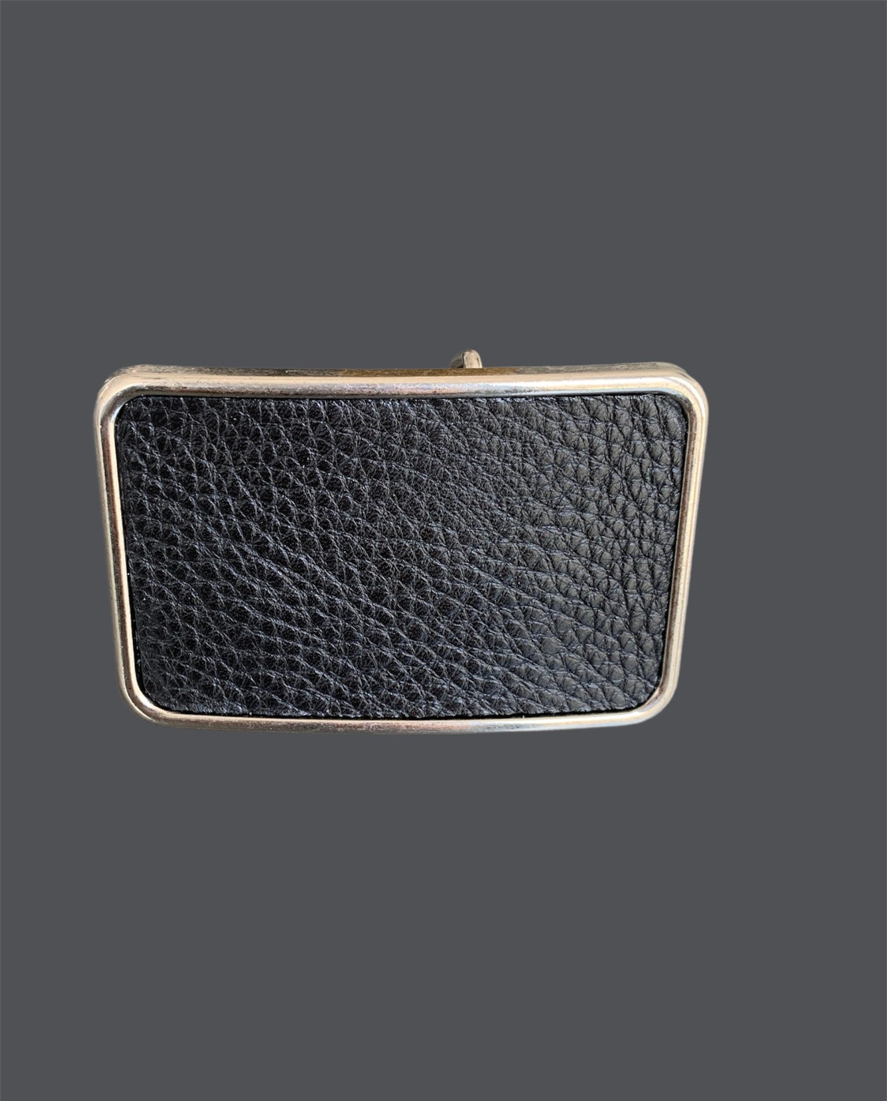 A pebbled leather belt buckle that is paired with a black interchangeable belt is a classic everyday accessory. The rectangular buckle is available in a silver tone finish. The pebbled leather buckle is versatile so it can be worn both casual and dressy. The buckle is available in genuine black leather. The 1.5" interchangeable belt snaps onto the Pebbled leather buckle.