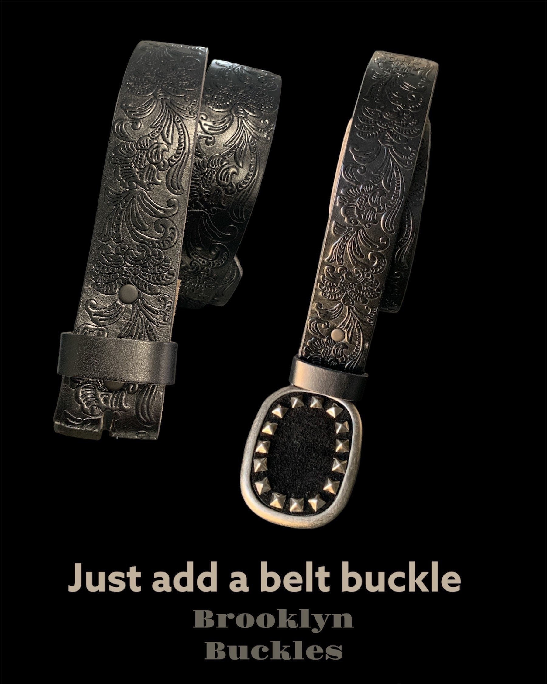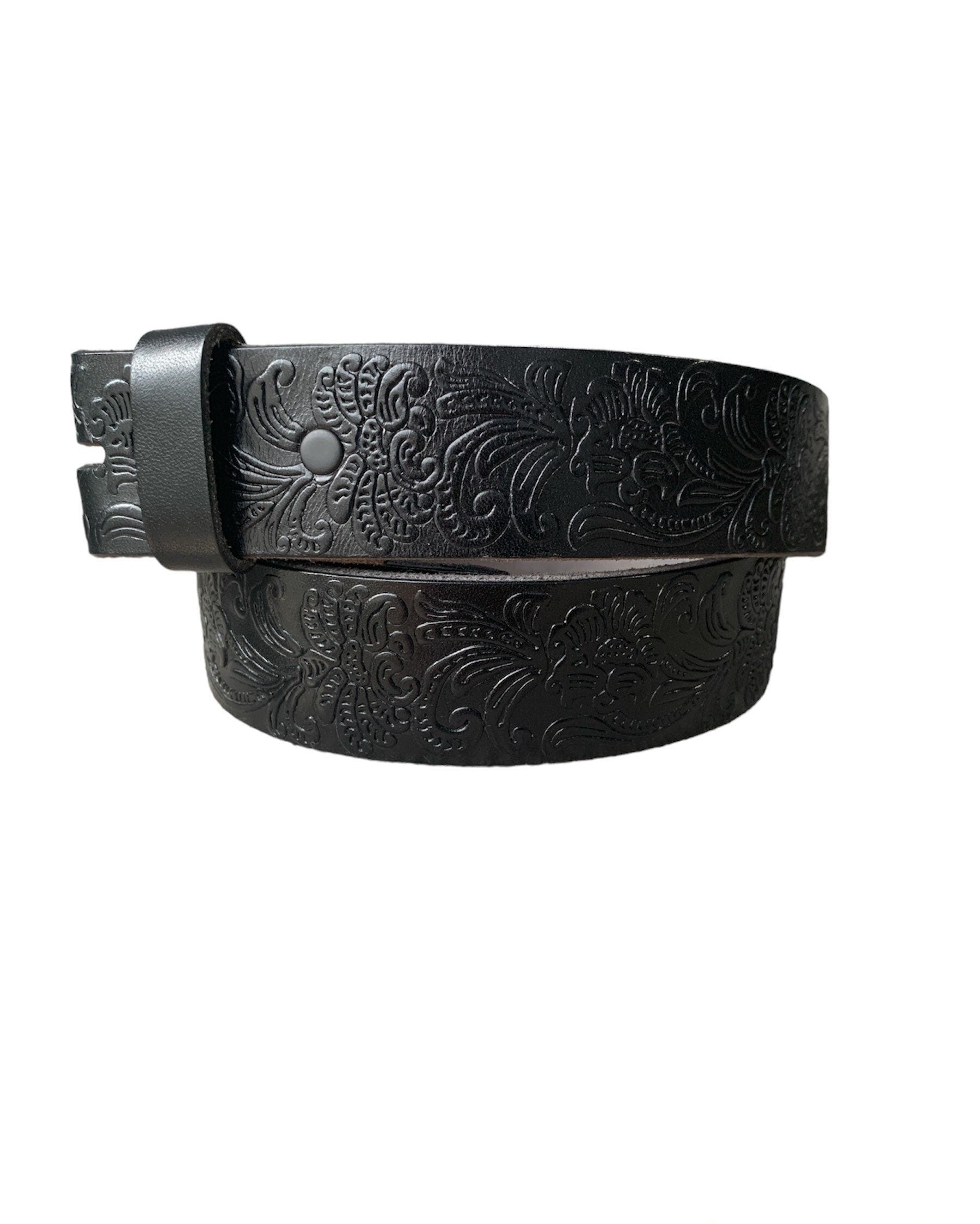 A black embossed western leather belt is an outfit changer. The embossed black belt is a full-grain leather interchangeable snap belt strap that can be paired with one of our many buckles. The tooled interchangeable belt has a snap system for easy belt buckle changes. The belt is 1.5 inches or 38 mm wide. The belt has black snaps and 7 belt holes. This listing is for the interchangeable belt only.