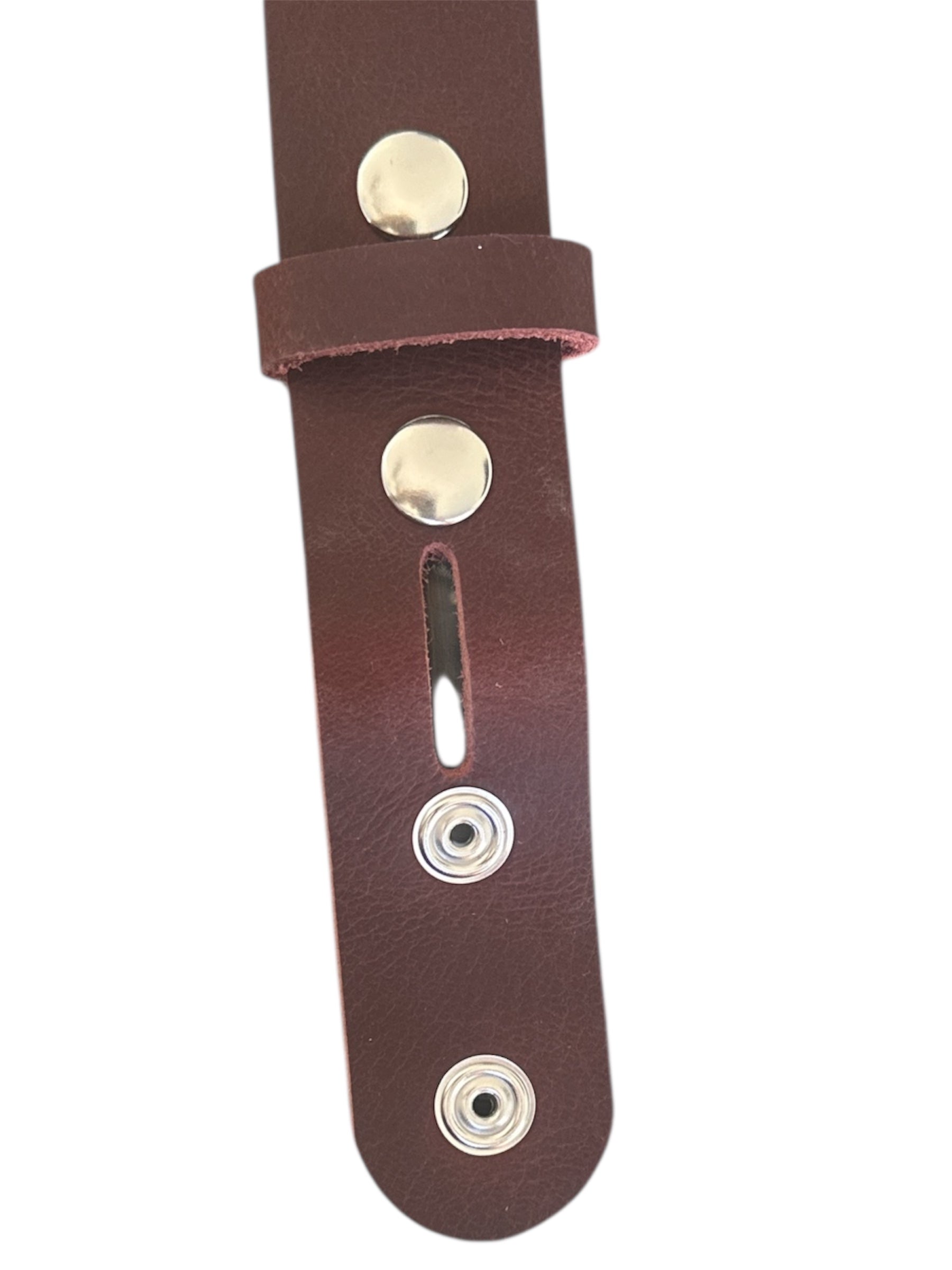 A burgundy full-grain leather belt strap that you can pair it with one of our many buckles. The interchangeable belt has a snap system for easy belt buckle changes. The belt is 1.5 inches or 38 mm wide. The burgundy or maroon strap has a matte finish(not glossy) and silver/metal snaps.