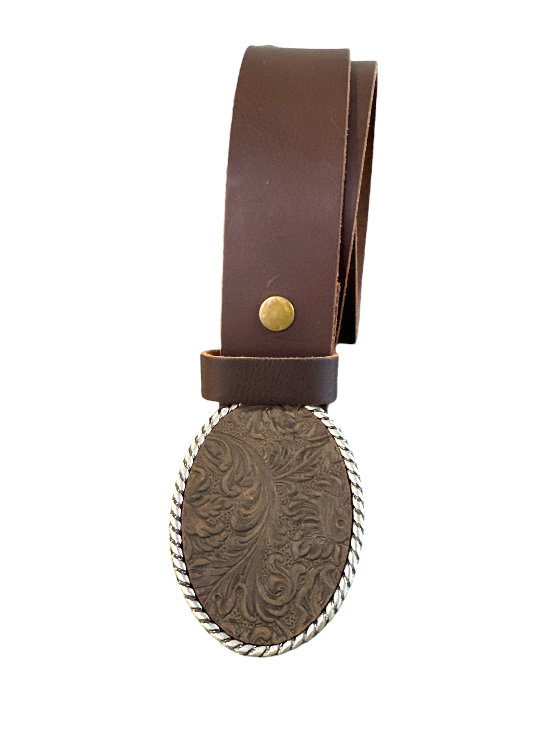 A dark brown embossed leather belt buckle is a stylish and classic accessory that can compliment any outfit. It's antique brass or antique silver finish and high quality leather make it a must have accessory for any wardrobe. The oval belt buckle has been handcrafted in genuine leather. The buckle is available in black leather and tan too.