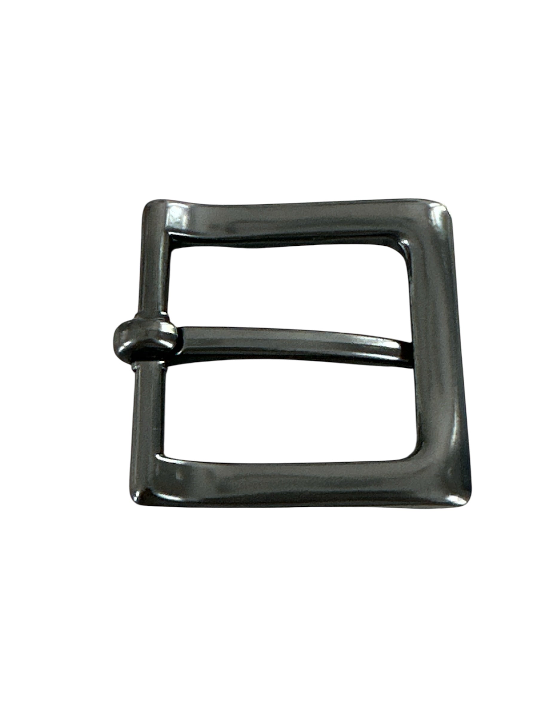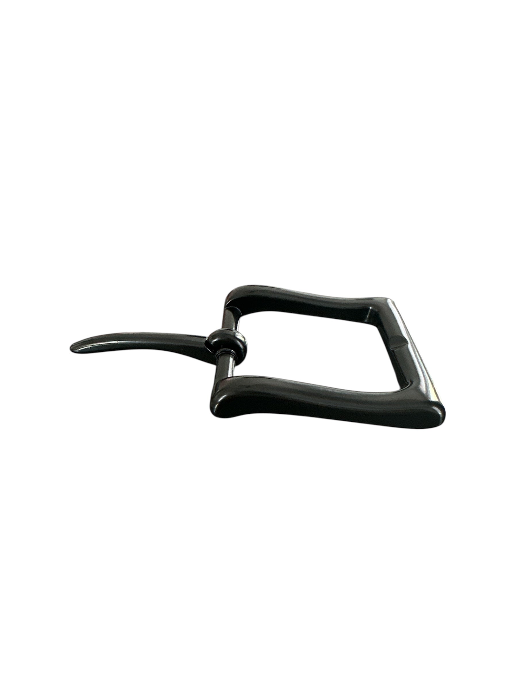 The black 1 prong belt buckle is an interchangeable buckle that easily snaps onto your belt. The buckle has a square shaped top. The buckle has a nice weight not flimsy and a little glossy shine to it.