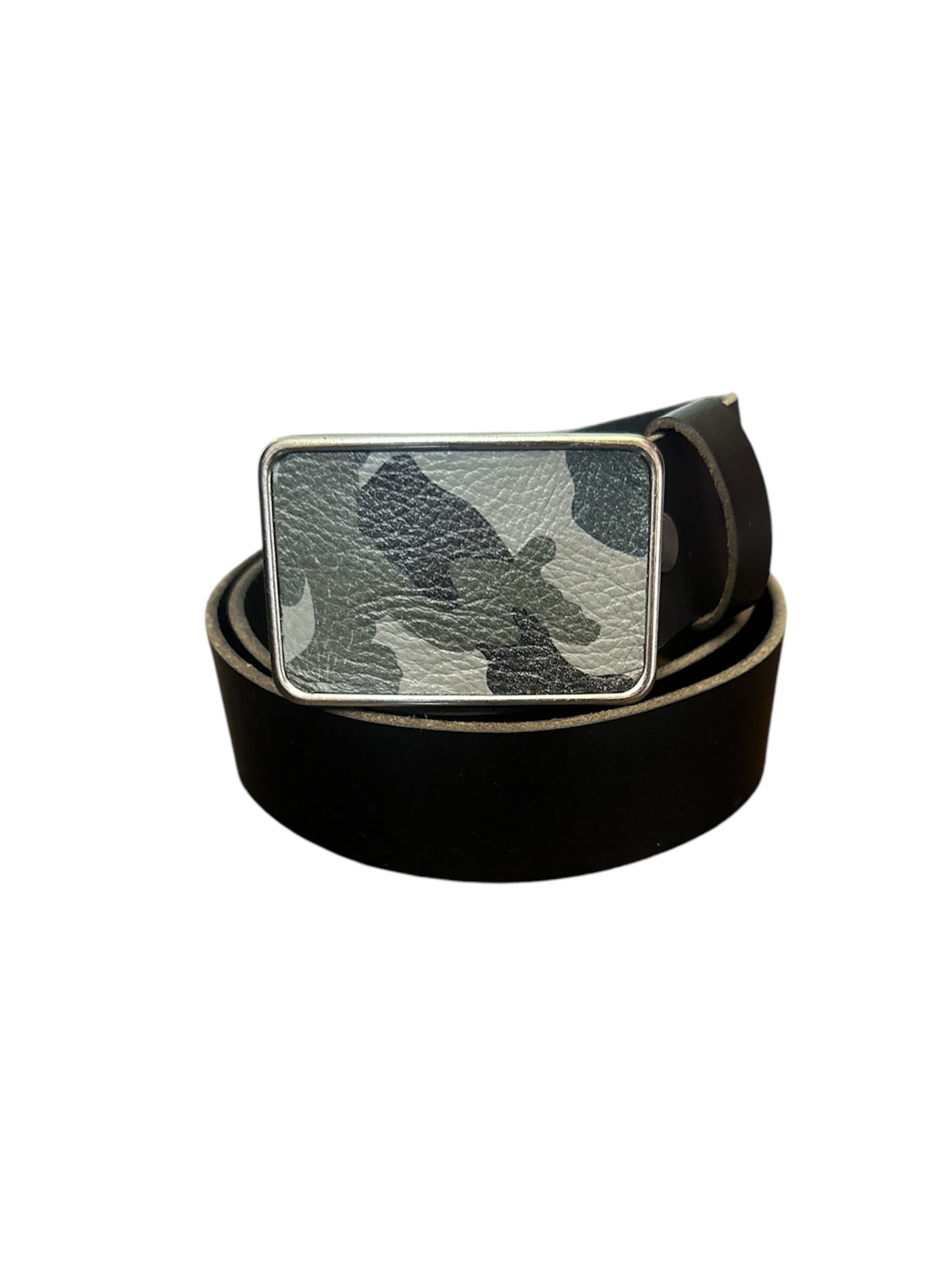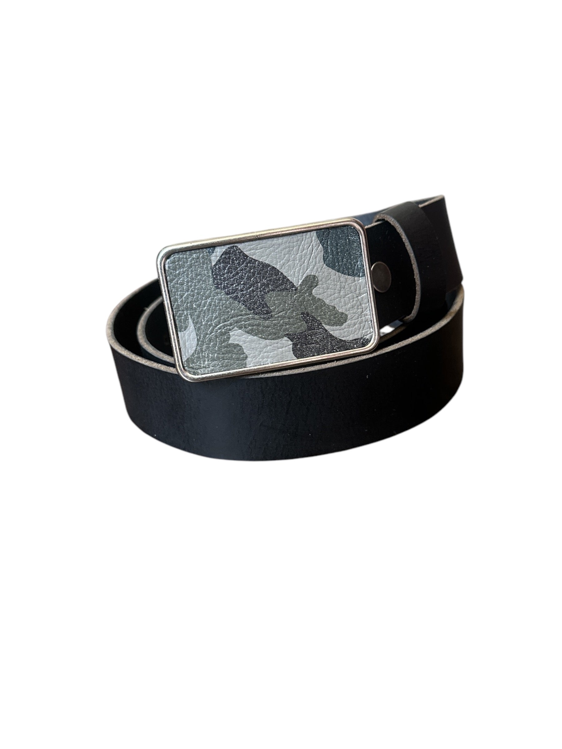 A camouflage printed leather belt buckle is a stylish accessory to have in your wardrobe. It is designed in a silver tone finished buckle. The colors of the camouflage print are black, light gray and dark gray. The interchangeable rectangular buckle just snaps onto one of Brooklyn Buckles belt straps and instantly changes the look of your outfit. The buckle fits belts up to 1 1/2 inches or 38 mm wide. The camo belt buckle is paired with an interchangeable snap belt to show off your style!
