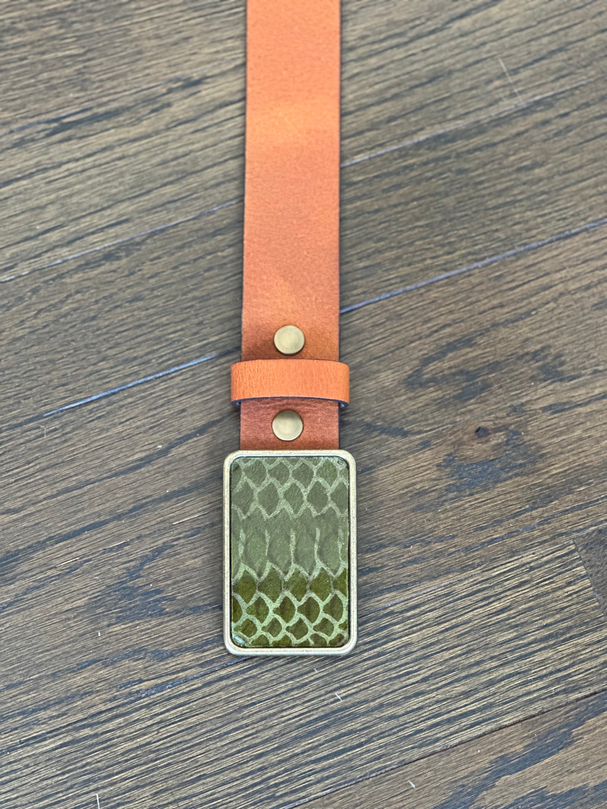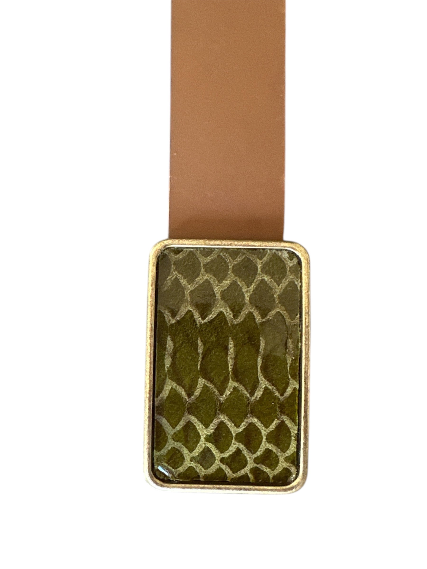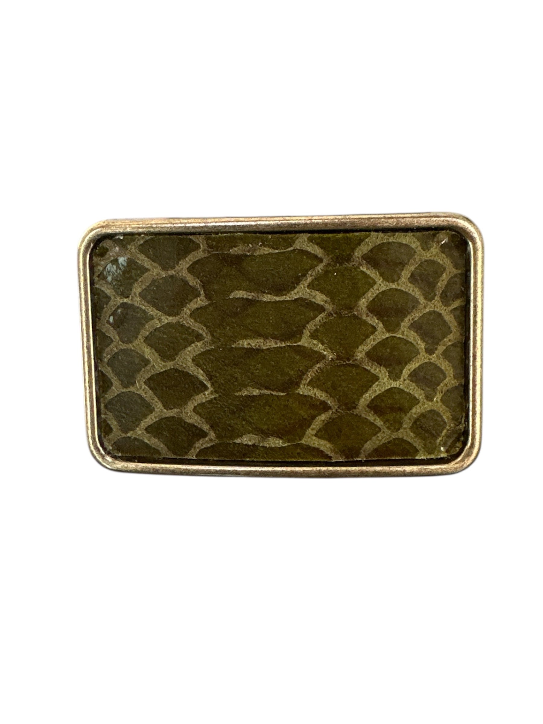 Upgrade your outfit and unleash your inner fashionista with a green python embossed leather belt buckle. The patent leather print is set on a rectangular belt buckle that comes in an antique brass finish. The vibrant green color adds a fun twist to any outfit. Be bold and stylish with this must-have accessory!