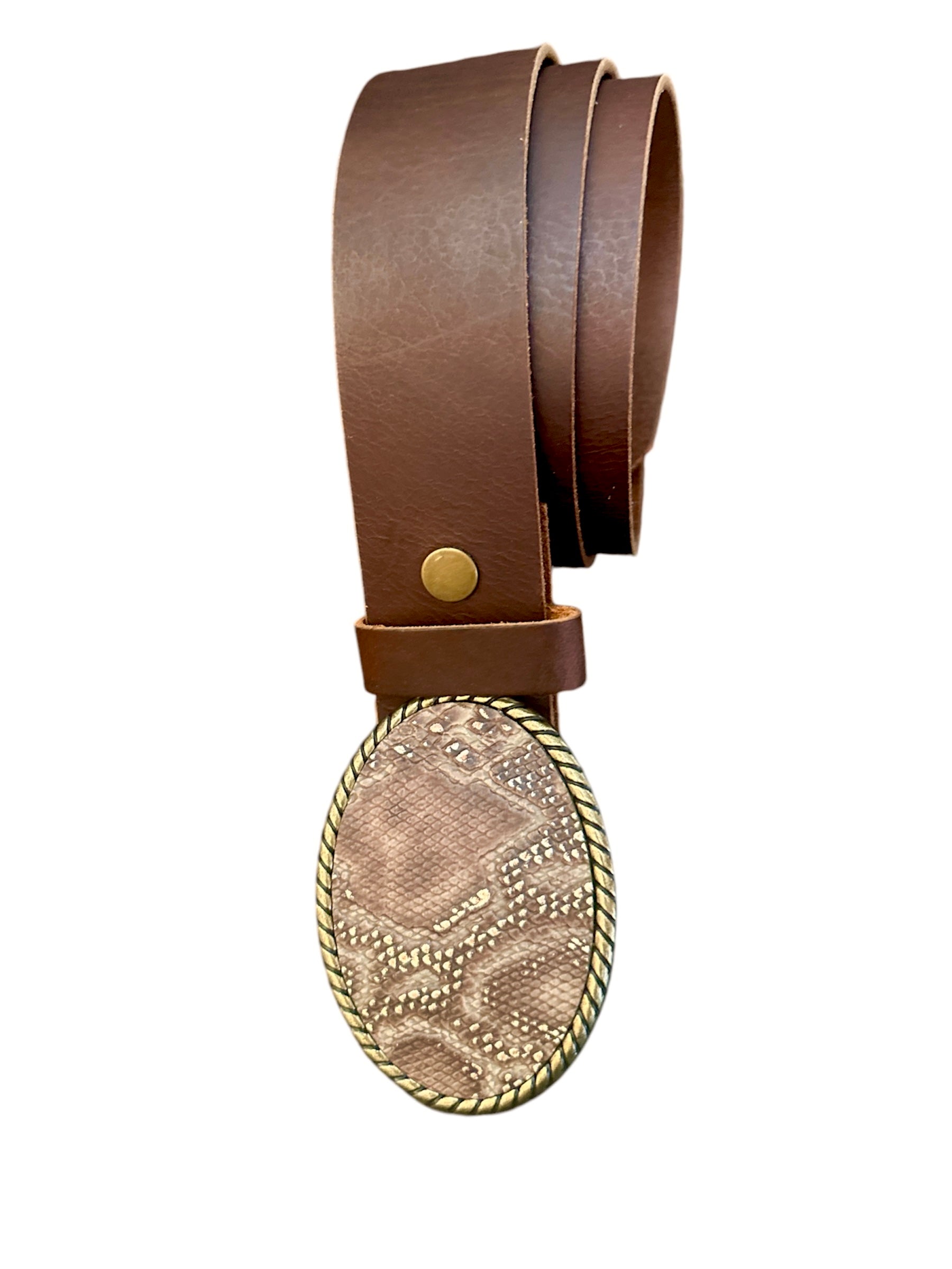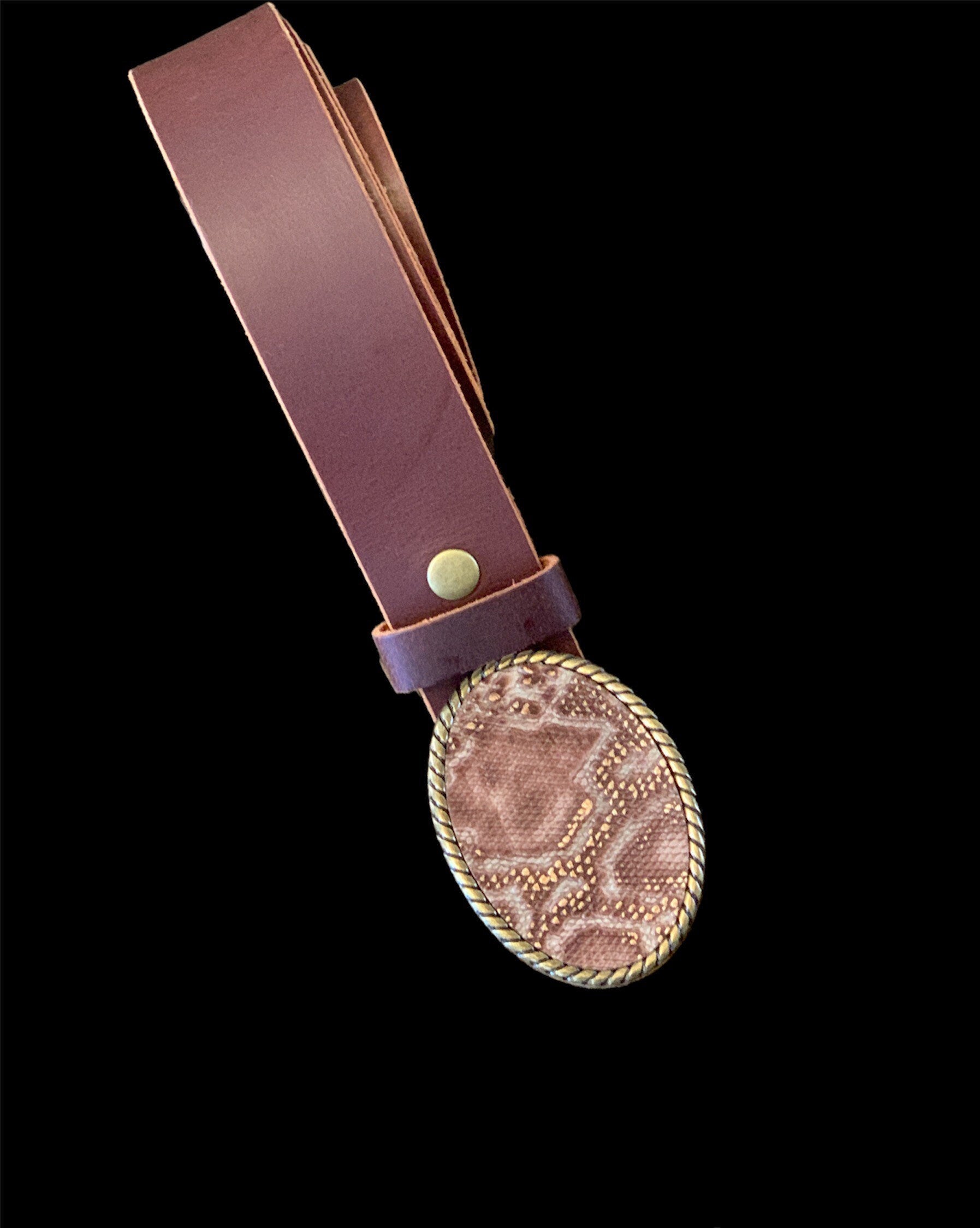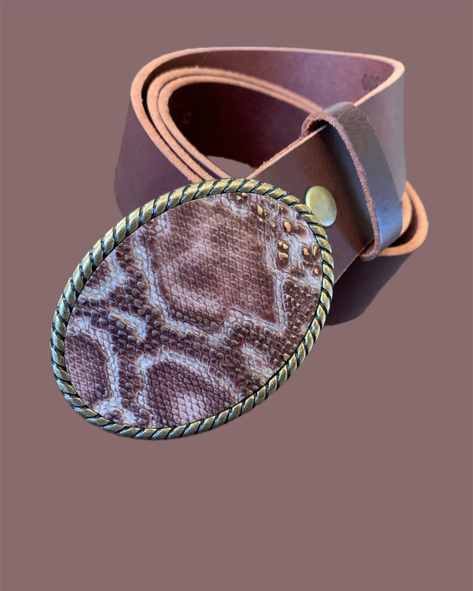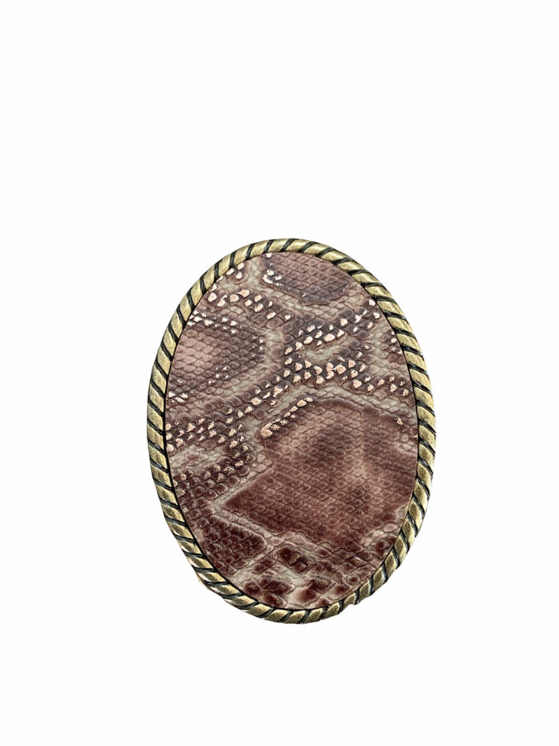 A Python printed leather belt buckle in bronze is a stylish choice! The embossed python print really makes a statement and completes your outfit. The oval rope buckle is easy to add to your favorite belt. Dress up your outfit when it needs a little extra something. The buckle can be paired with many of Brooklyn Buckles interchangeable snap belts.
