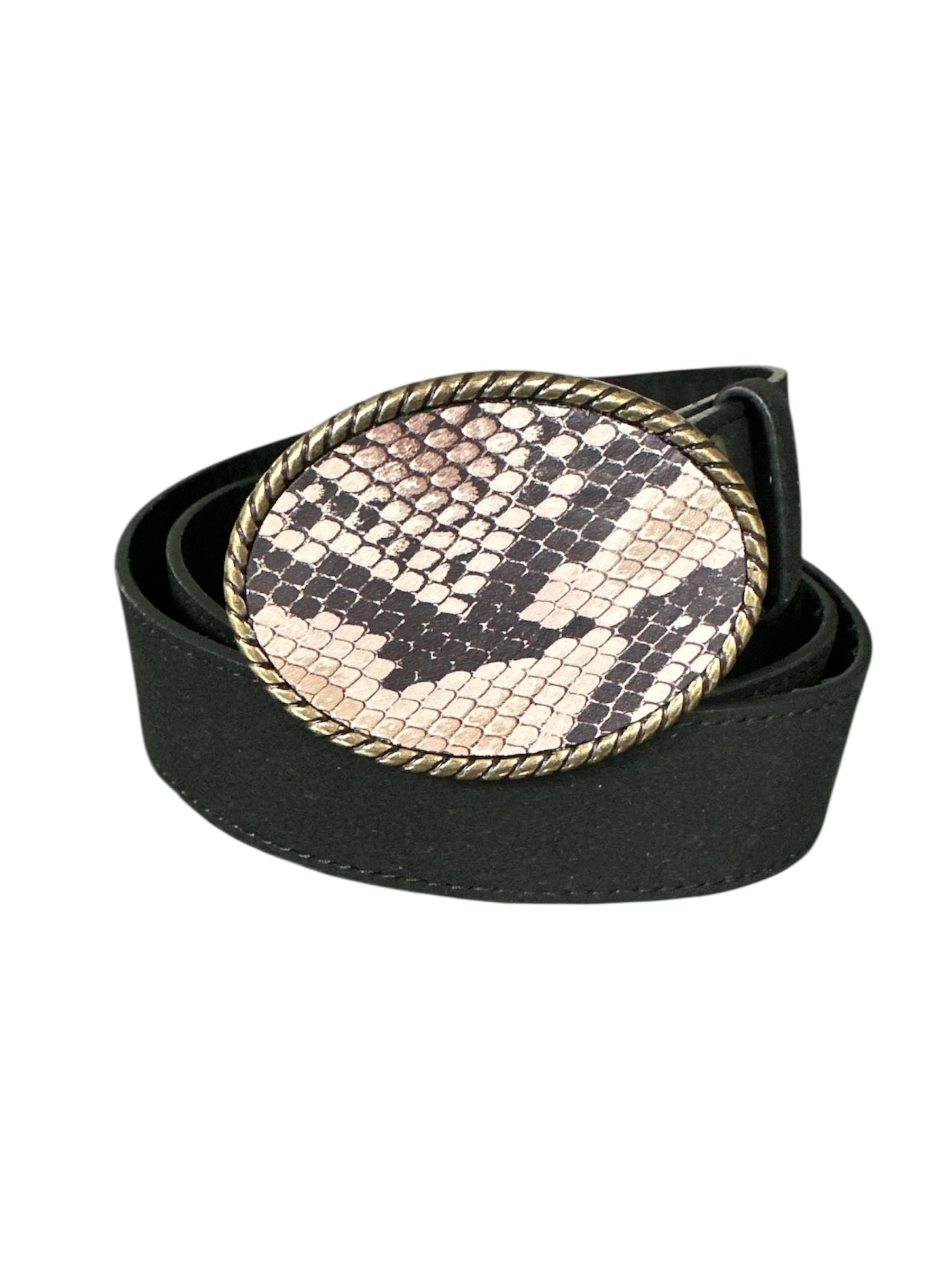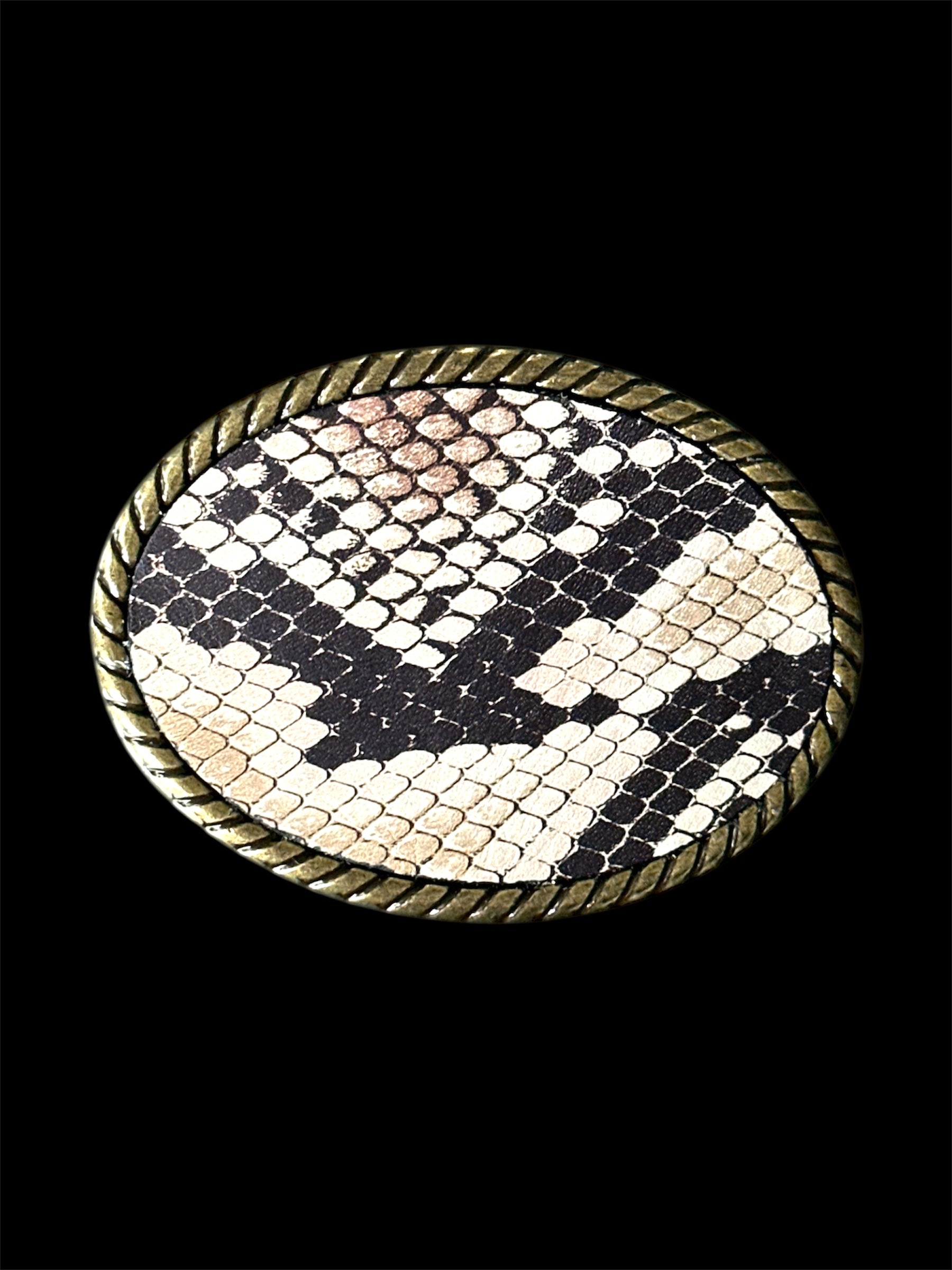 A Python printed leather belt buckle makes a bold statement. The snake skin print pattern will catch your eye. The oval rope belt buckle comes in antique brass. The buckle has the ability to attach to different belts, you can mix and match to your heart's desire.