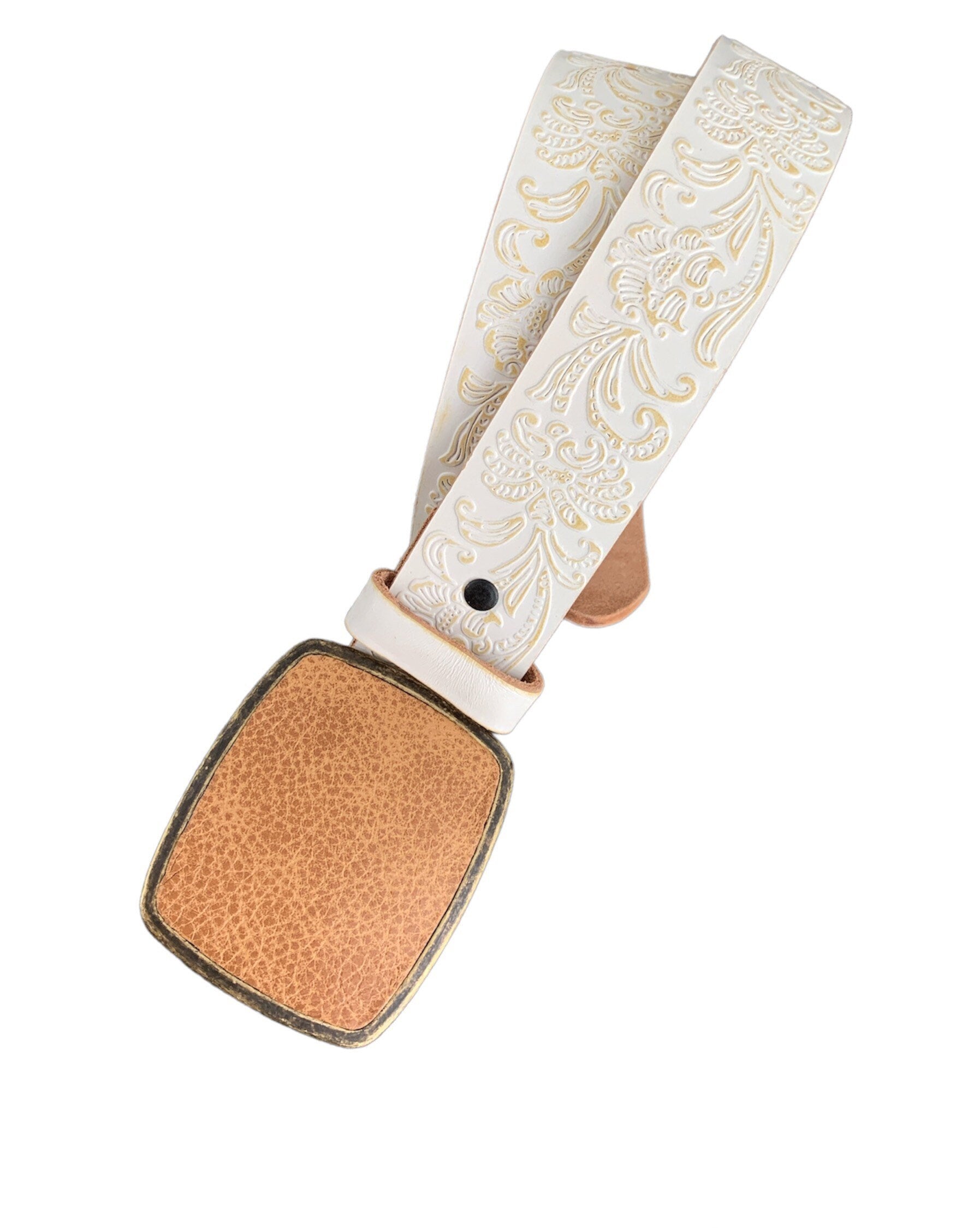 Add a touch of rustic charm to your outfit with our weathered tan leather buckle. Made of antique brass, this western-inspired accessory is perfect for casual weekend ensembles with jeans, boots, and a t-shirt. (Belt not included.)