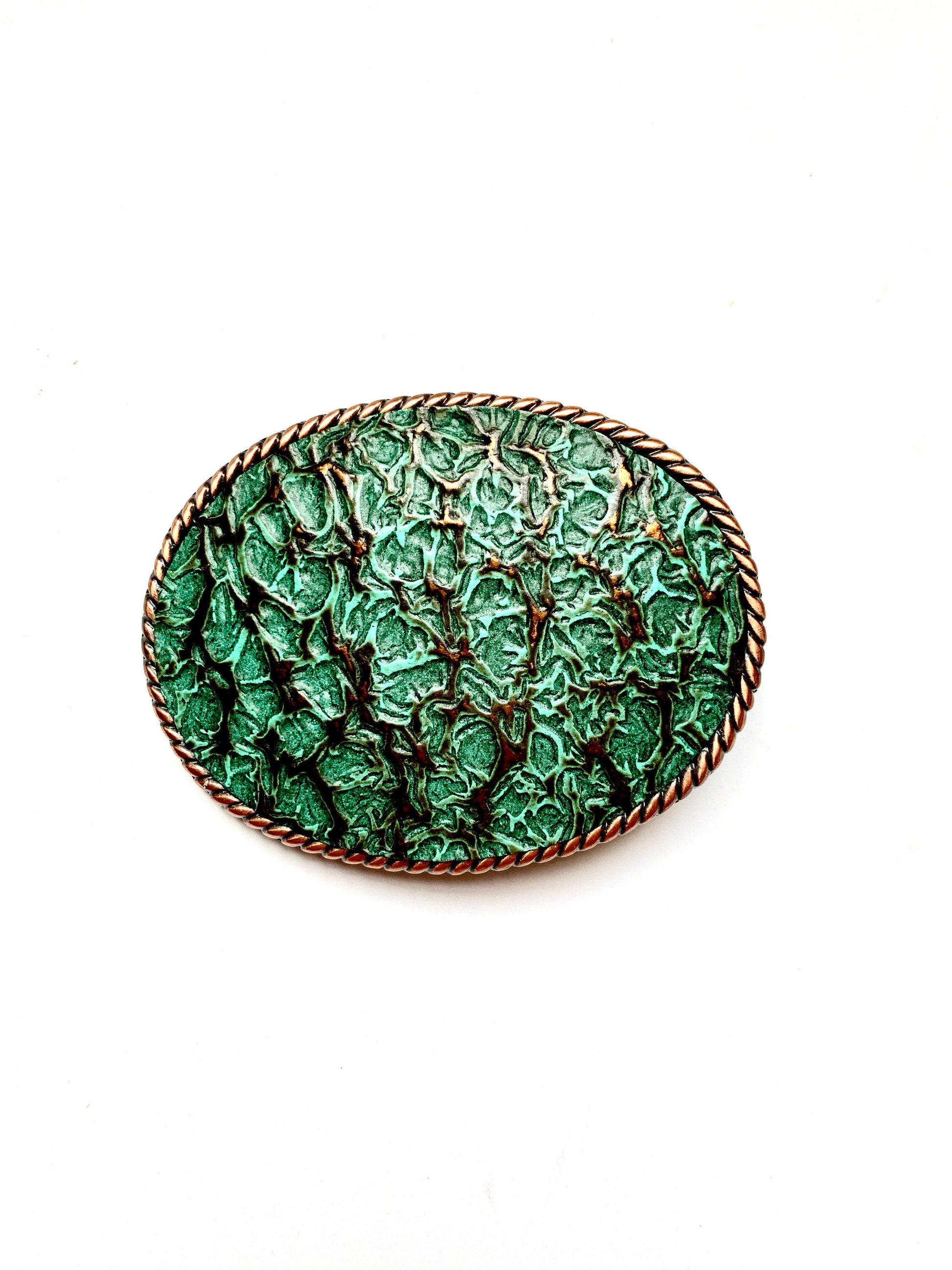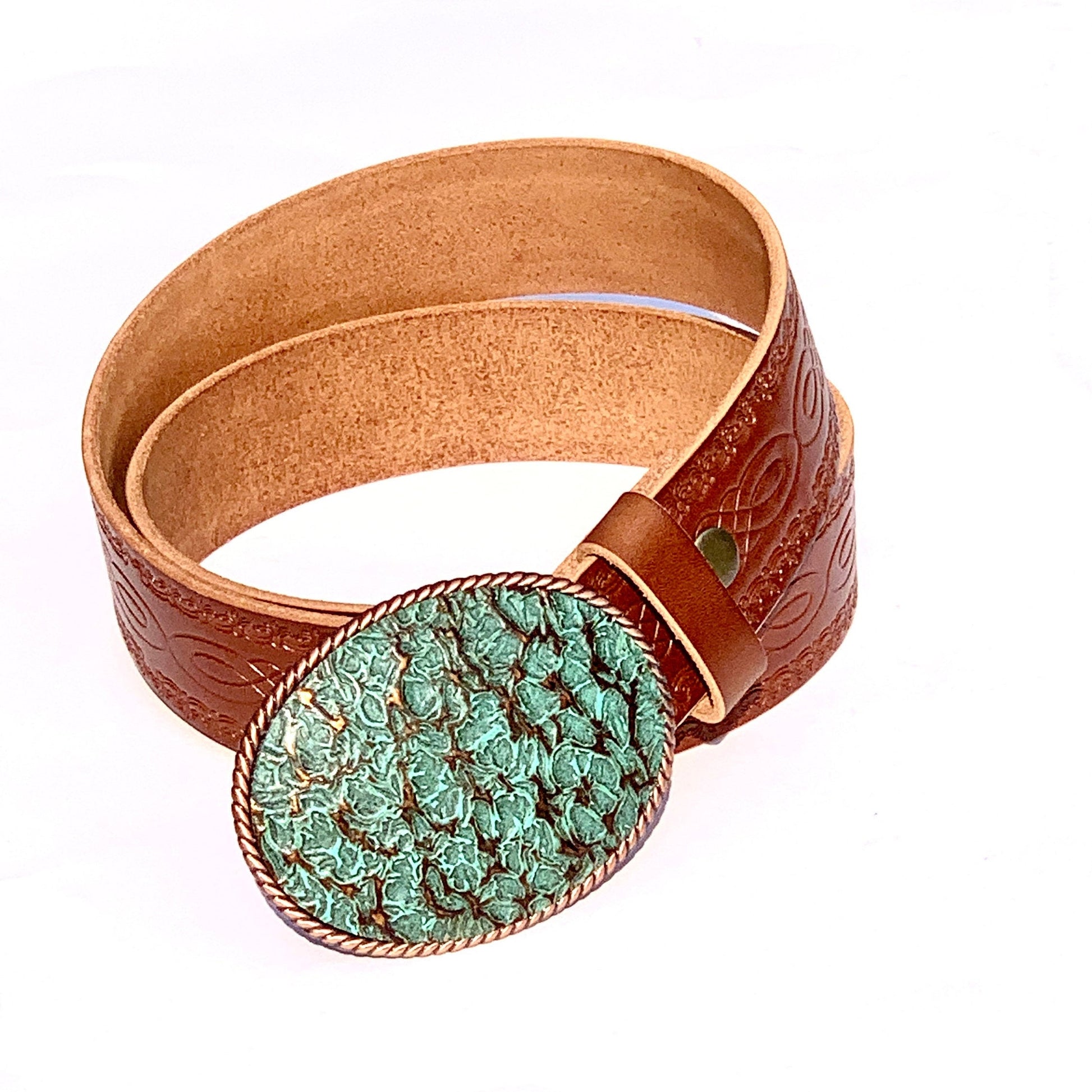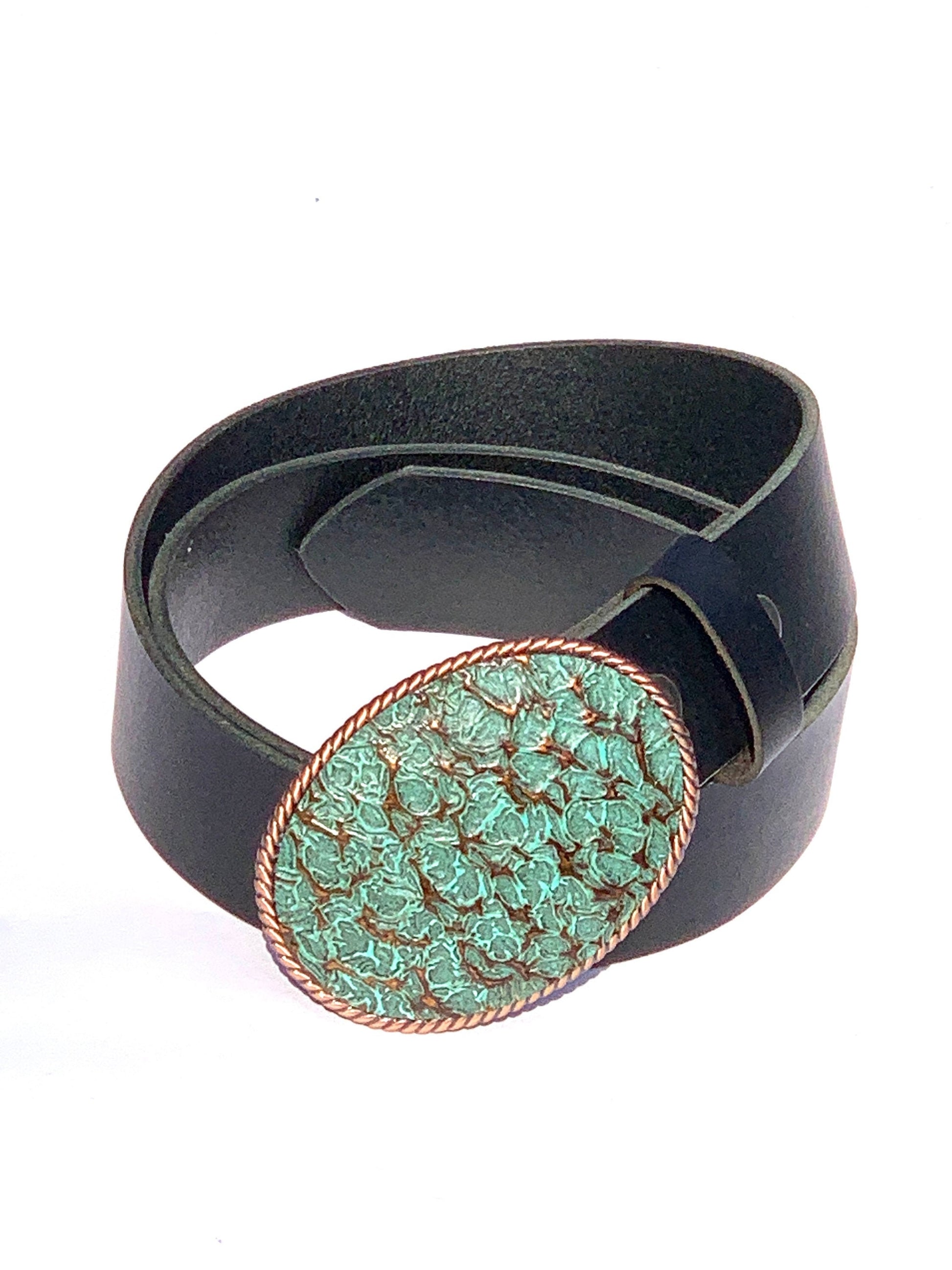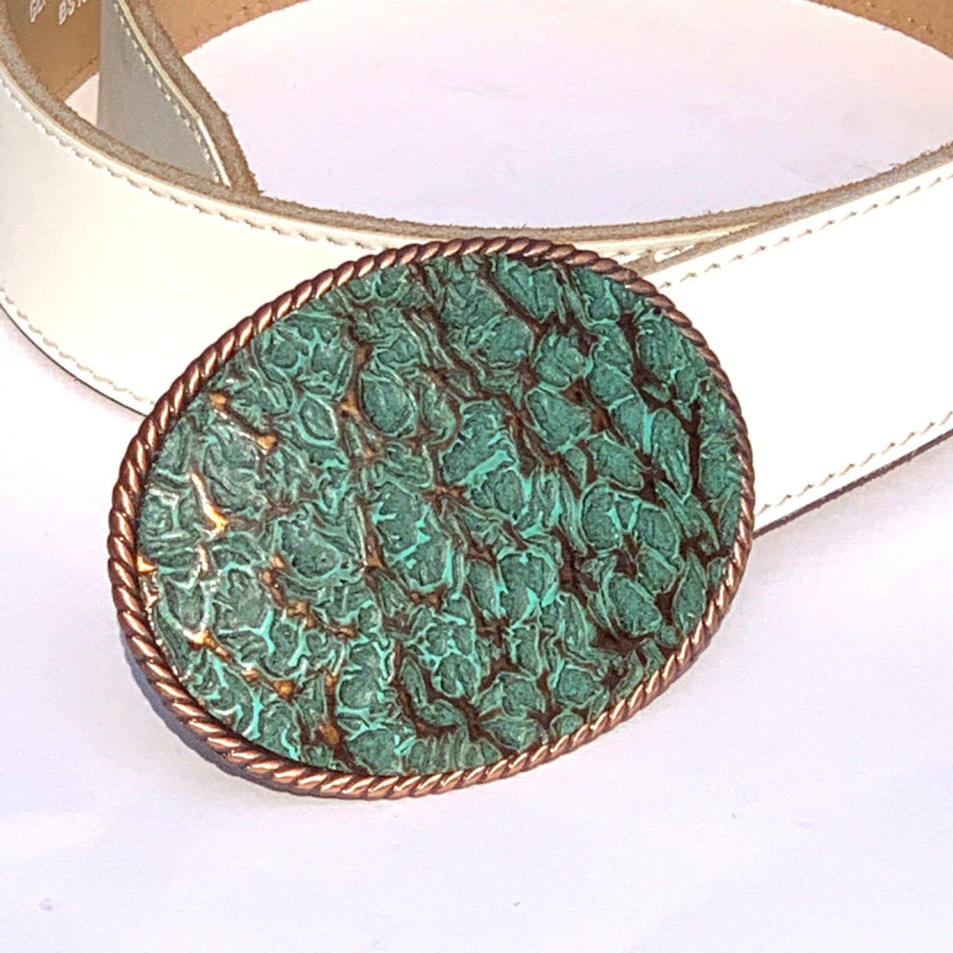 Turquoise embossed leather that is accented with bronze looks amazing on a copper belt buckle. The bronze and turquoise colors together can really infuse a pop of color into your wardrobe. The turquoise leather is set on a copper finished rope belt buckle. The oval buckle is interchangeable with a no buckle belt. The buckle easily can snap onto an interchangeable belt and instantly can change the look of your outfit. This buckle looks great with a black, white and even brown belt. The copper buckle really makes a statement and looks great with a pair of jeans and boots.
