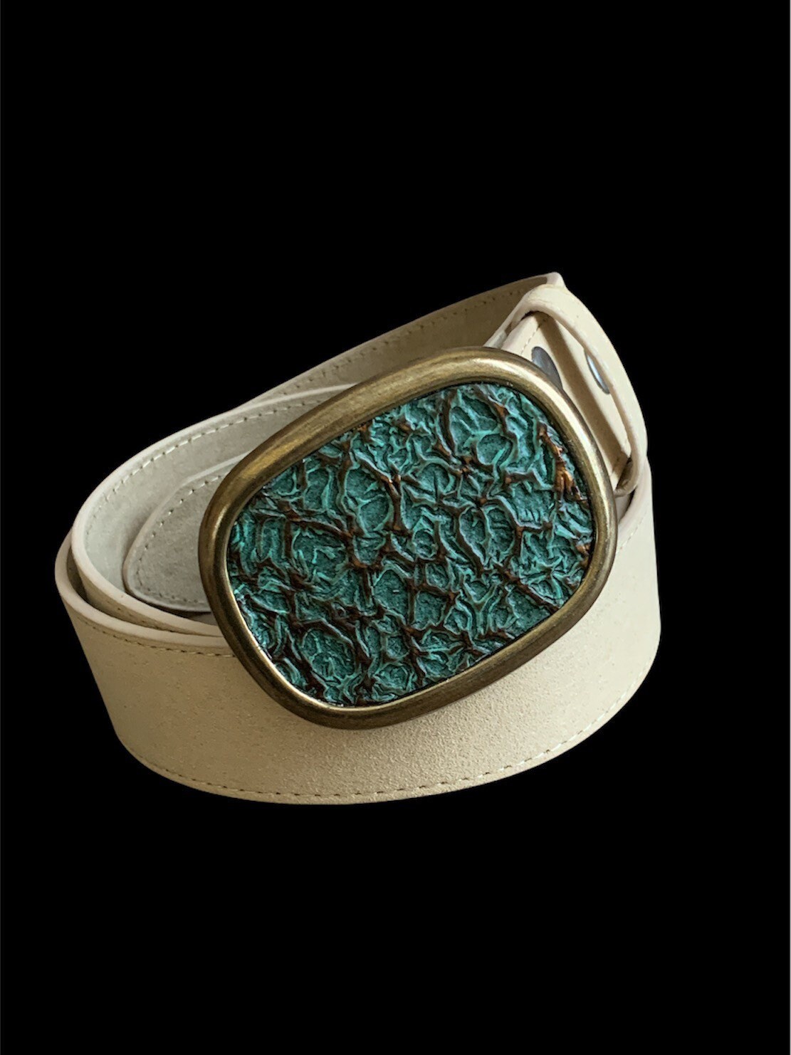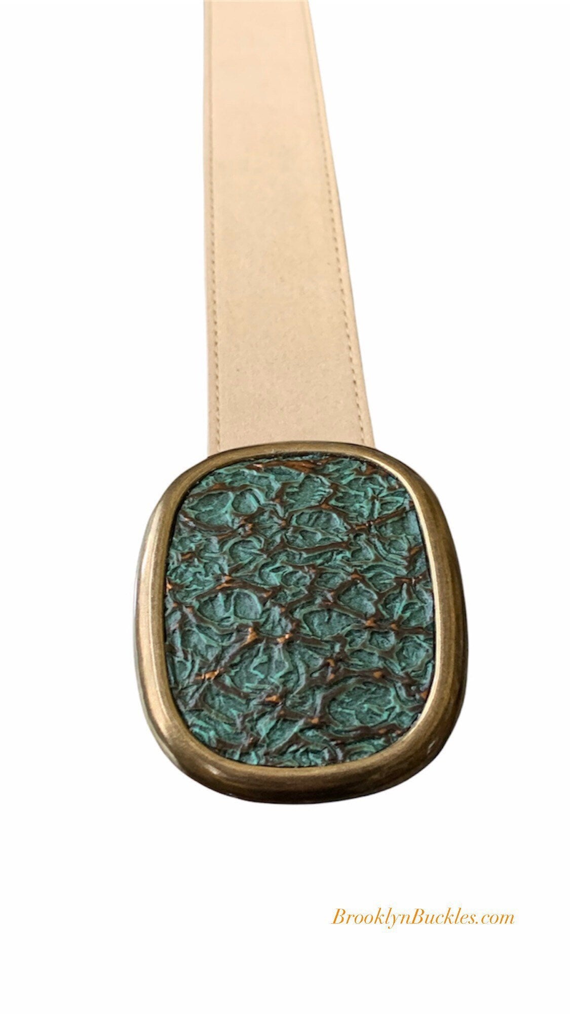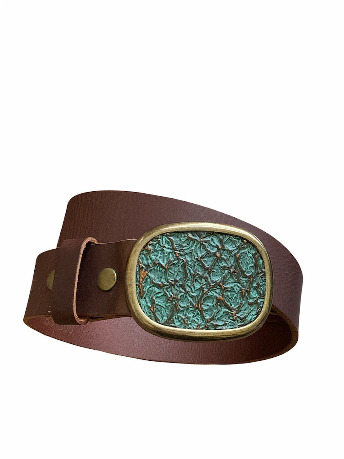 Turquoise leather that is accented with bronze looks amazing on an antique brass belt buckle. The bronze and turquoise colors together can really infuse a pop of color into your wardrobe.