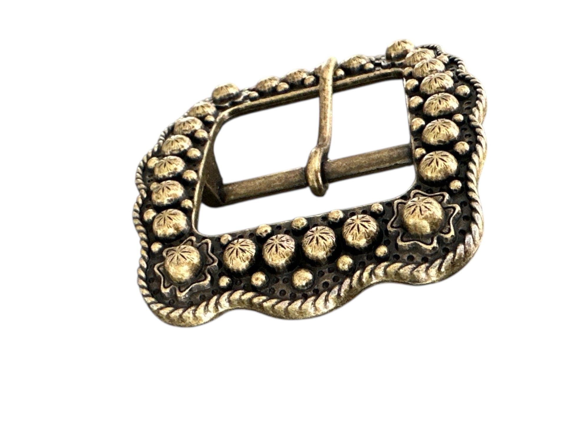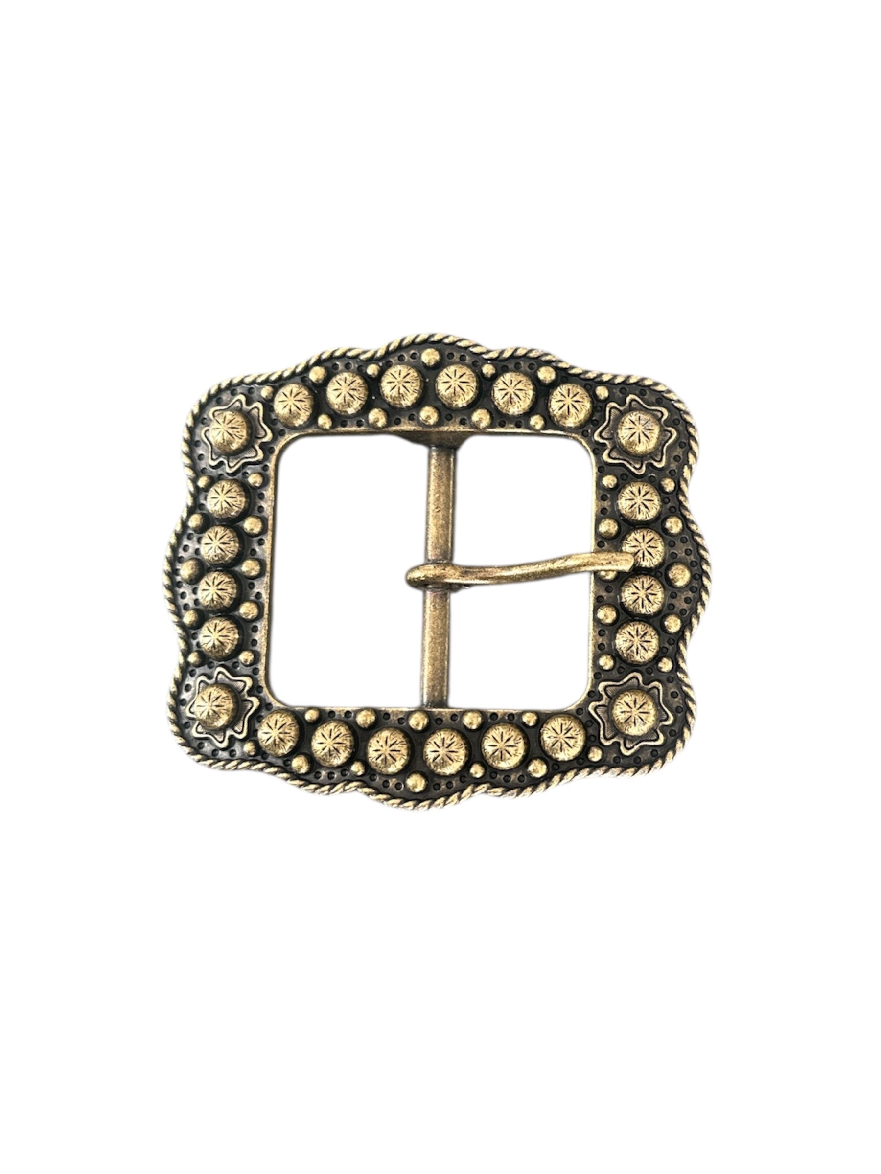 Add a touch of western flair to your outfit with a berry Concho style belt buckle. This antique brass belt buckle fits belts up to 1 1/2 inches wide and can be easily attached with a snap. Mix and match with different colors for a unique look. This antique brass buckle has some weight to it.